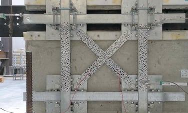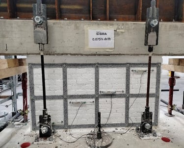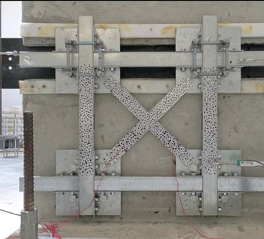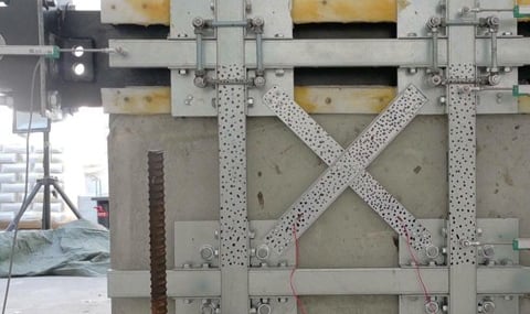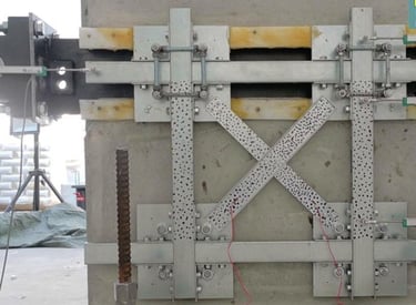 Il provino utilizzato è quello di un test precedente, in cui la parete (non rinforzata) era stata testata fino al raggiungimento di un certo livello di danno. Dopodiché, il provino è stato risarcito dove vi era la fessura diagonale e poi rinforzato con il suddetto sistema in acciaio, applicato a secco su entrambi i lati. Il test è interessante poiché permette di quantificare il contributo positivo di un certo sistema anche su un elemento che ha subito dei danni e leggere riparazioni (ovvero rappresentativo di un edificio esistente che ha subito diversi terremoti e qualche intervento minore di riparazione, prima della messa in sicurezza definitiva).