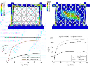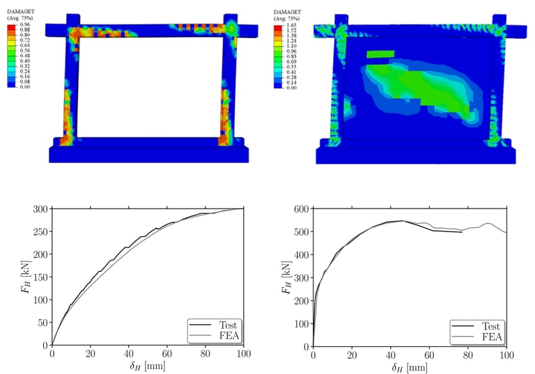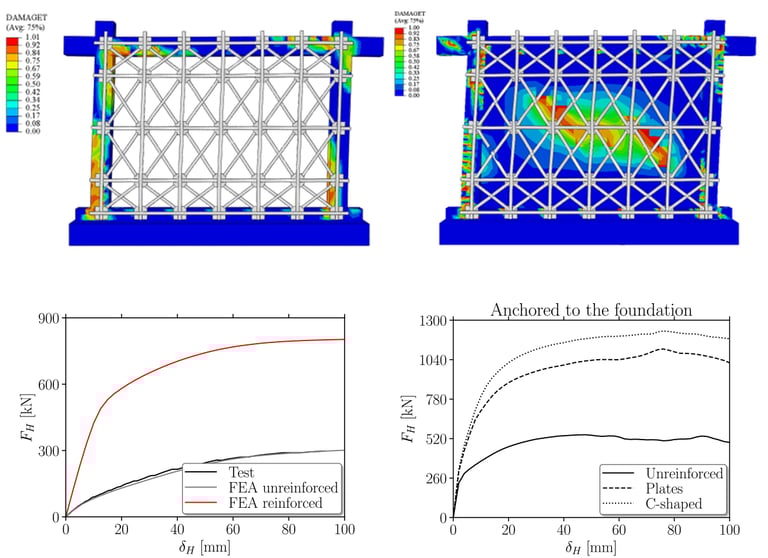 Tali strumenti permettono di modellare i diversi materiali tenendo conto delle loro non linearità e di riprodurre fedelmente la storia di carico effettivamente applicata ai provini. Le curve di risposta forza – spostamento mostrano un perfetto accordo tra sperimentale e numerico. Questo tipo di modellazione è fondamentale poiché, se la replica del test è sufficientemente fedele (come in questi casi) è possibile fare previsioni sul comportamento dello stesso sistema, variando numerosi fattori (densità del rinforzo, proprietà del calcestruzzo esistente, tipologia del tamponamento, ecc.).